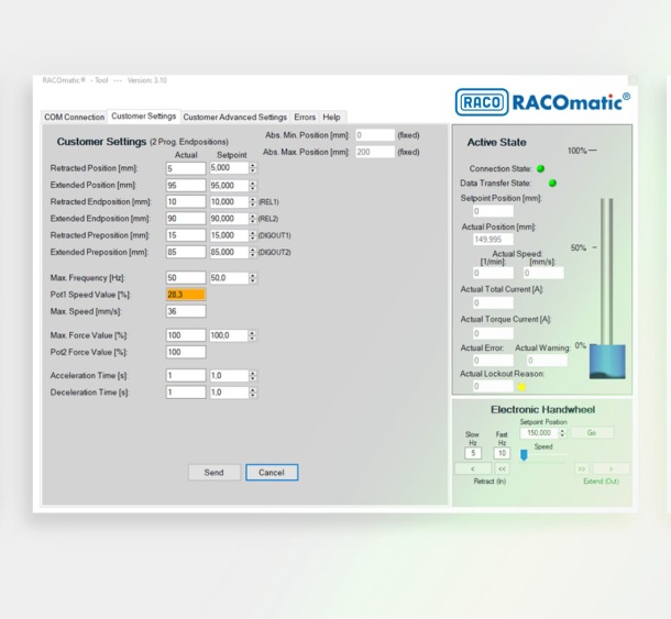 The RACOmatic® Tool parameterization and diagnostic software for Microsoft Windows makes commissioning and functional testing of your RACOmatic® electric actuator intuitively easy. For example, the software allows you to set speeds and positions and define acceleration and deceleration, and braking ramps - all within the maximum permissible values. To protect the mechanics of your systems, maximum forces can be defined and a force switch-off can be programmed for emergencies.